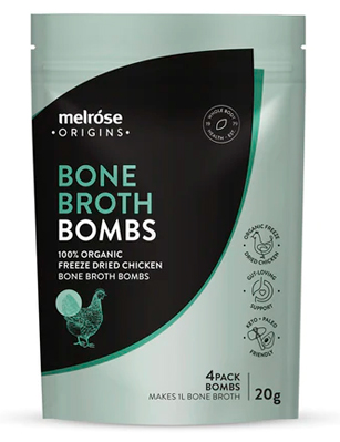 © Melróse Origins. Bombas de hueso de pollo liofilizado para caldo (Australia) – Se liofilizan para conservar todos los nutrientes, y cada bomba produce 250 ml de caldo delicioso y conveniente (Australia).