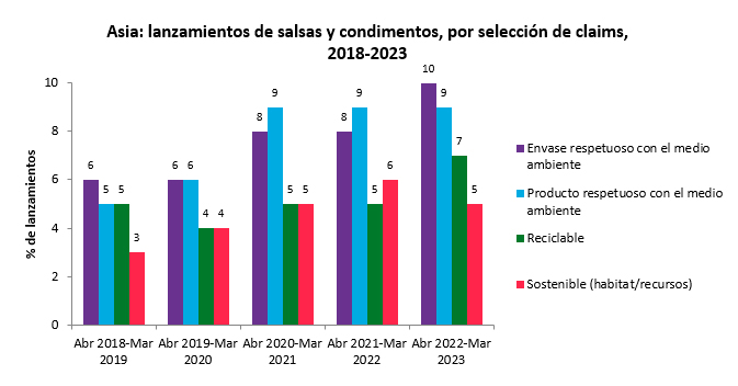 En el siguiente gráfico del informe A Year of innovation in Cooking Sauces & Seasonings de Mintel, observamos como los claims sobre envases sostenibles han ido creciendo en los últimos 5 años: